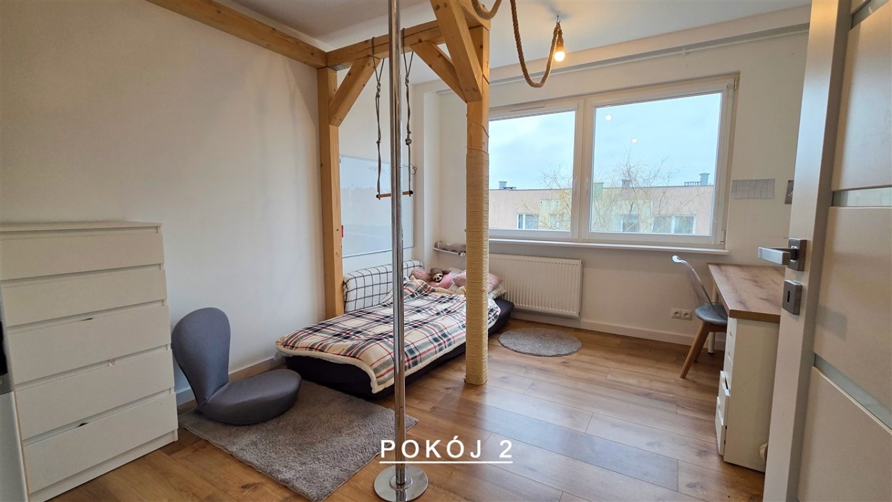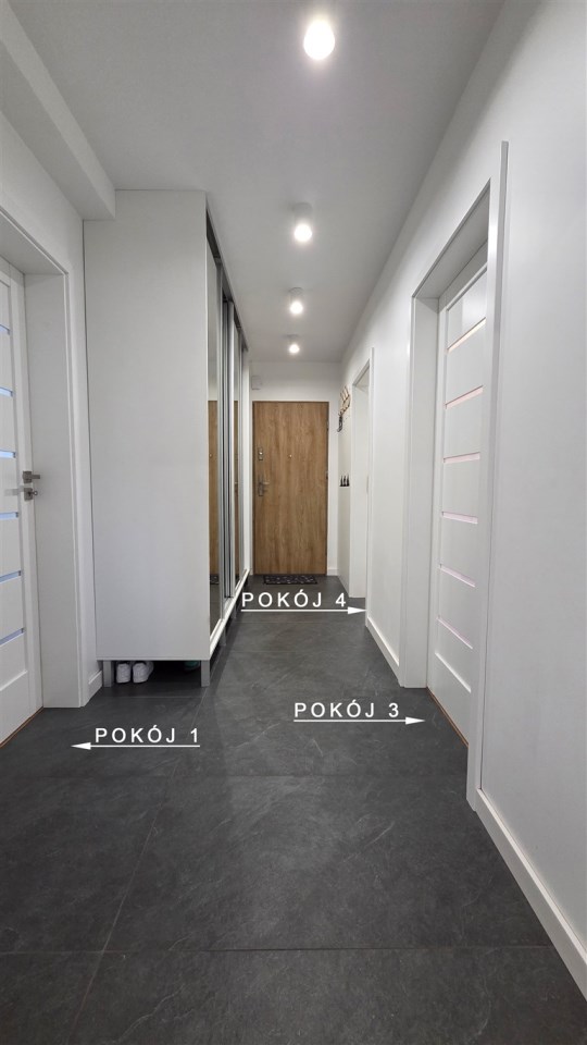Na powierzchnię mieszkania składa się duży salon, trzy sypialnie, kuchnia z jadalnią, łazienka z wanną i toaletą, osobna toaleta, przedpokoje oraz dwa duże balkony.