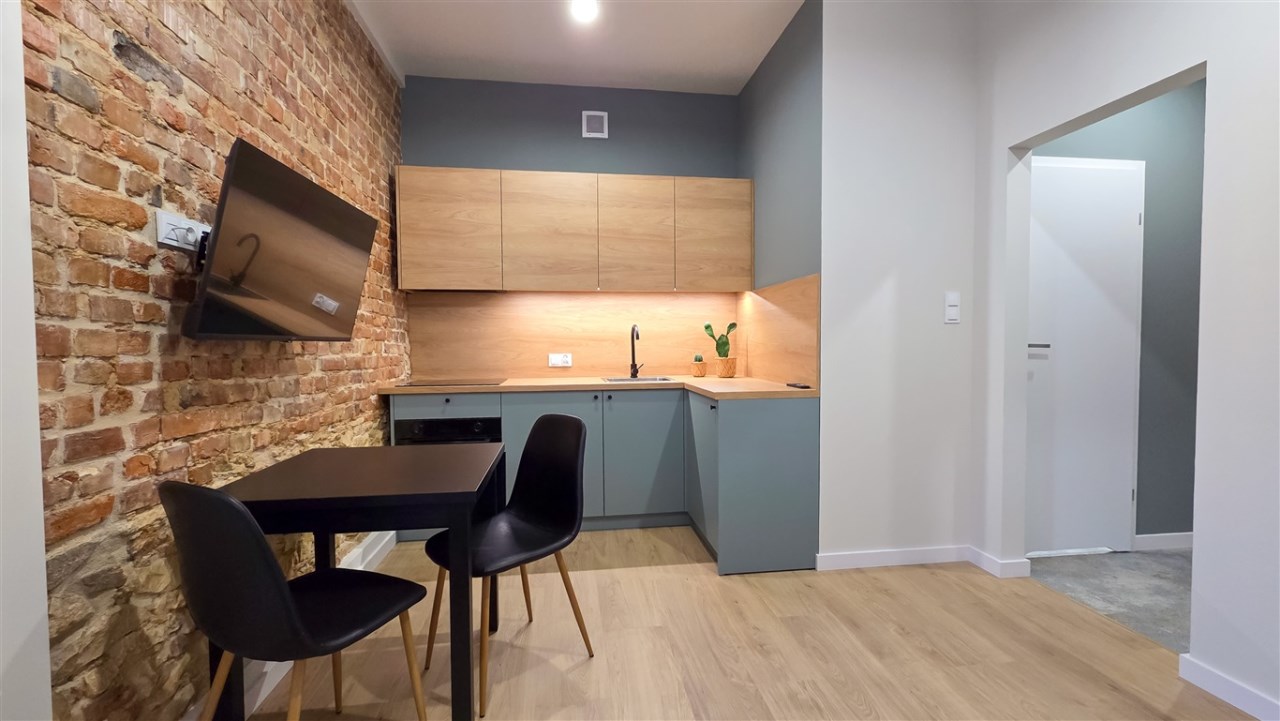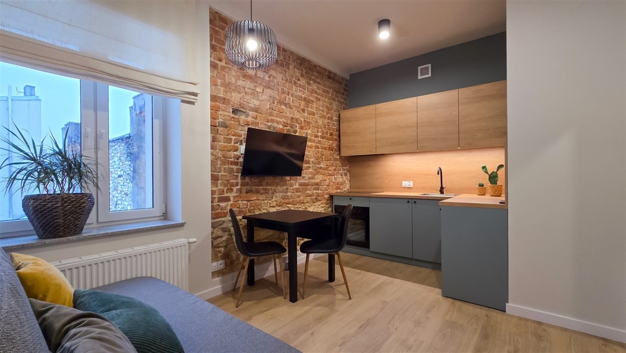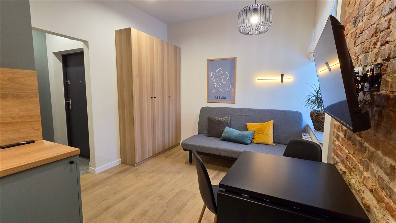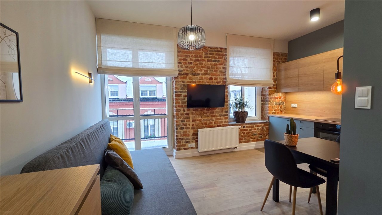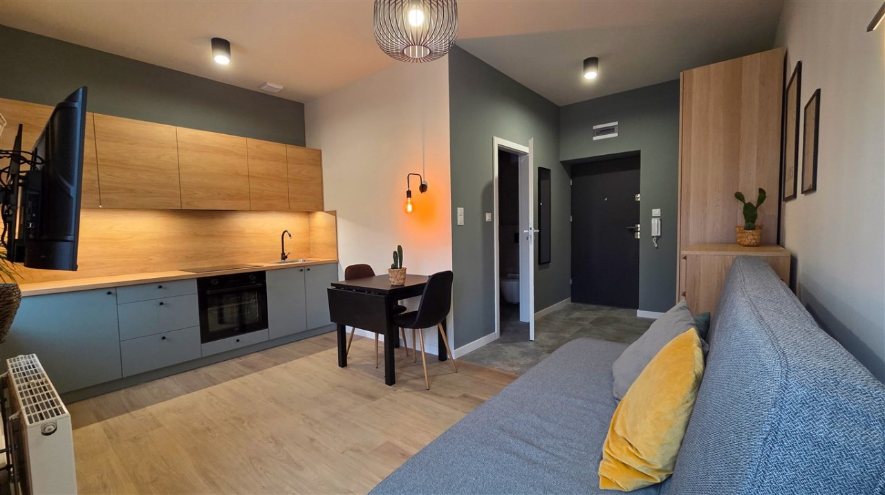 W mieszkaniu rozkładana kanapa, pojemna szafa i komoda, w aneksie kuchennym cały potrzebny sprzęt AGD oraz zabudowa meblowa.