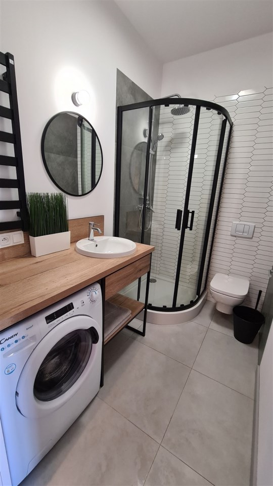 Łazienka z prysznicem oraz pralką.