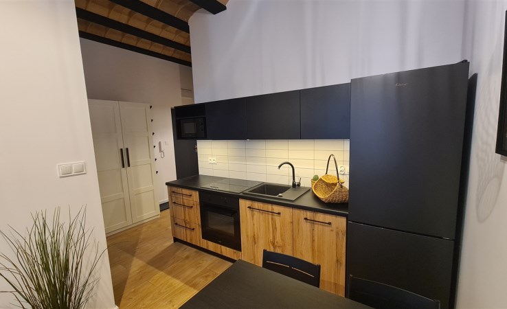 Pełne umeblowanie mieszkania, kuchnia ze sprzętem AGD- płyta, piekarnik, zmywarka, lodówka.