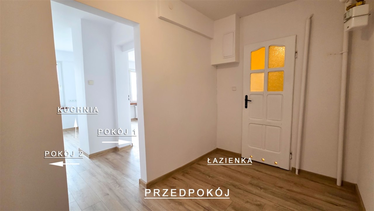 Mieszkanie o powierzchni 52,3mkw, na którą składają się dwa przestronne pokoje, kuchnia, duży przedpokój i łazienka.