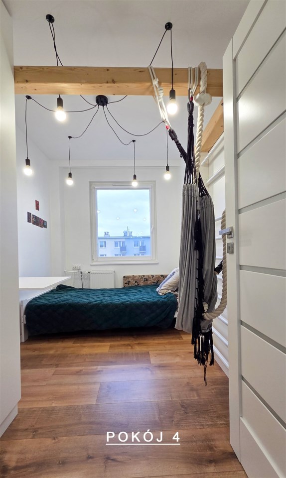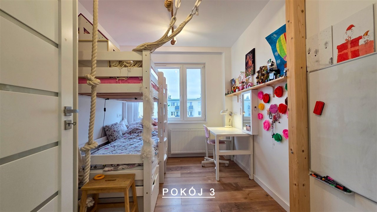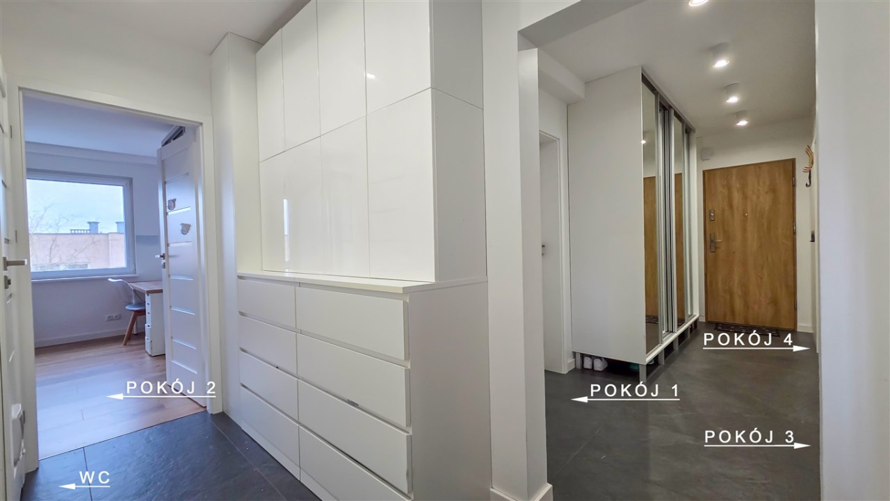 Na powierzchnię mieszkania składa się duży salon, trzy sypialnie, kuchnia z jadalnią, łazienka z wanną i toaletą, osobna toaleta, przedpokoje oraz dwa duże balkony.