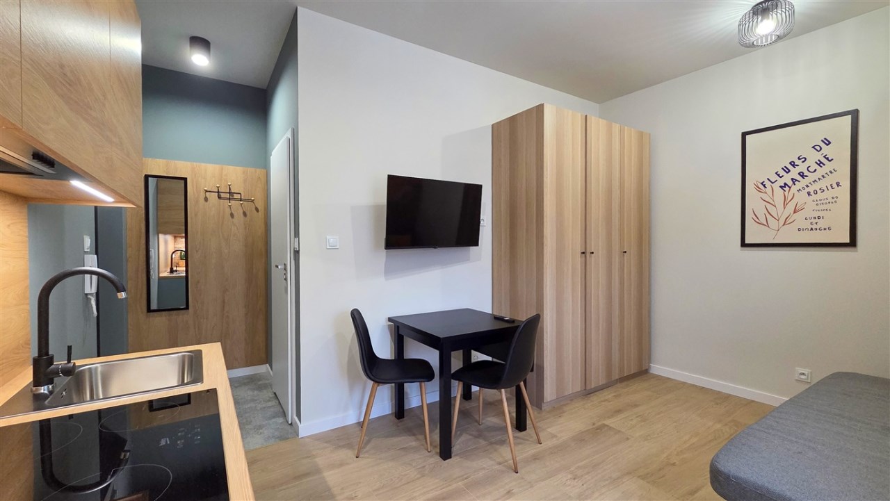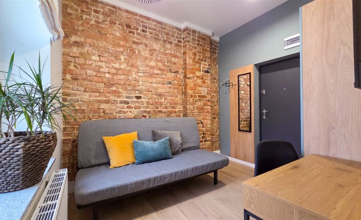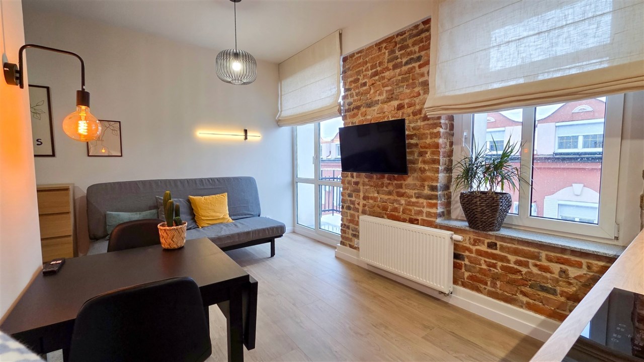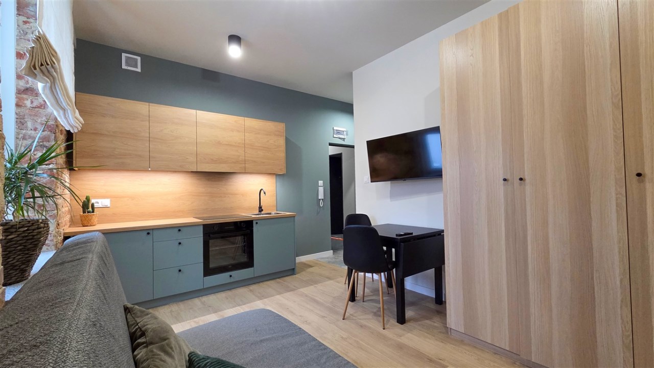 W mieszkaniu rozkładana kanapa, pojemna szafa i komoda, w aneksie kuchennym cały potrzebny sprzęt AGD oraz zabudowa meblowa.