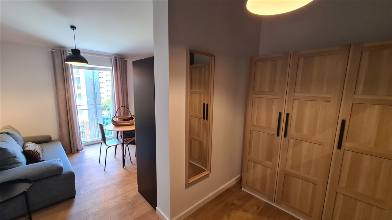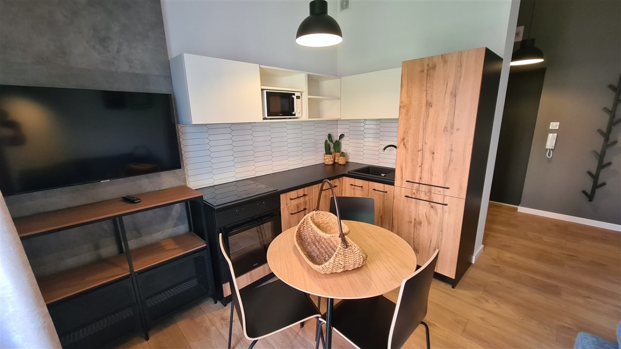 Pełne umeblowanie mieszkania, kuchnia ze sprzętem AGD- płyta, piekarnik, zmywarka, lodówka.